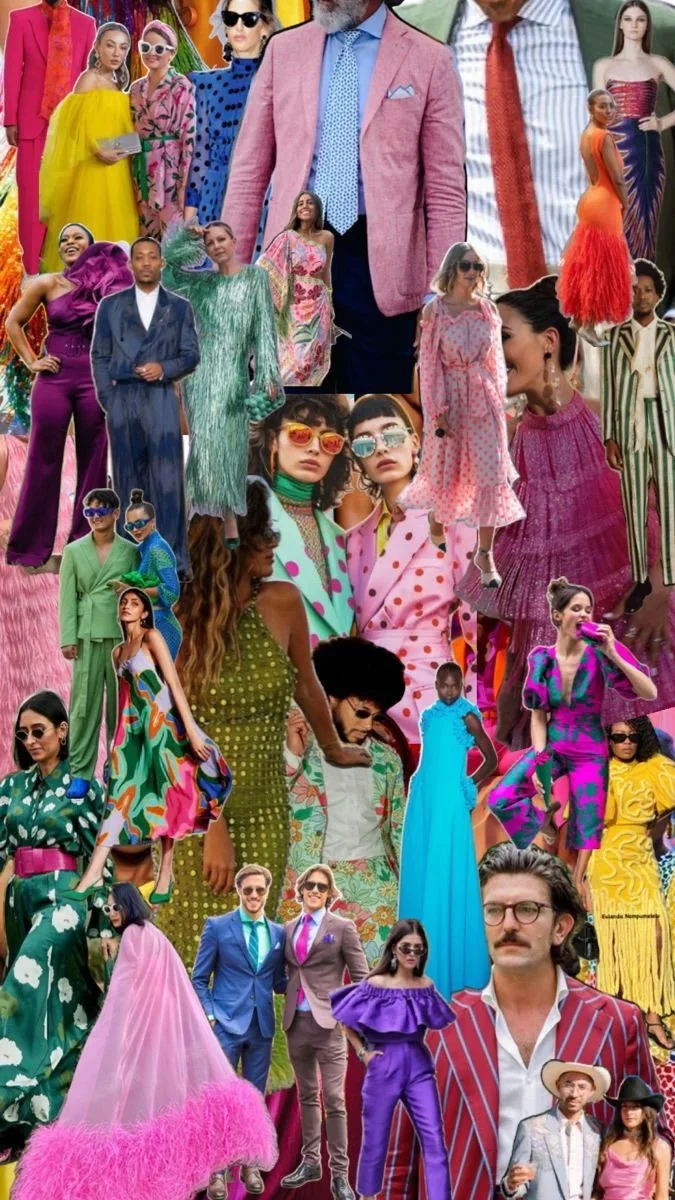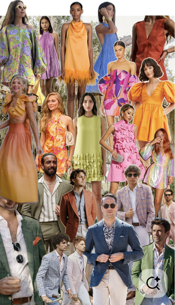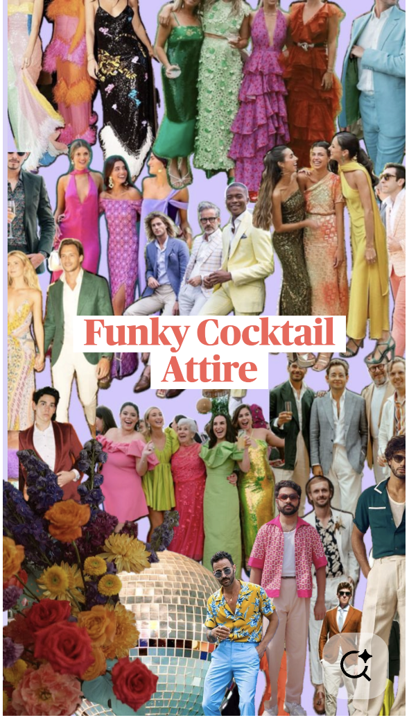 An elevated backyard party vibe - think cocktail attire with color, texture, and personality. No need for floor-length gowns or black tie.
